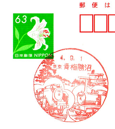 青梅勝沼郵便局の風景印 鉄道公園の建物と機関車を描く